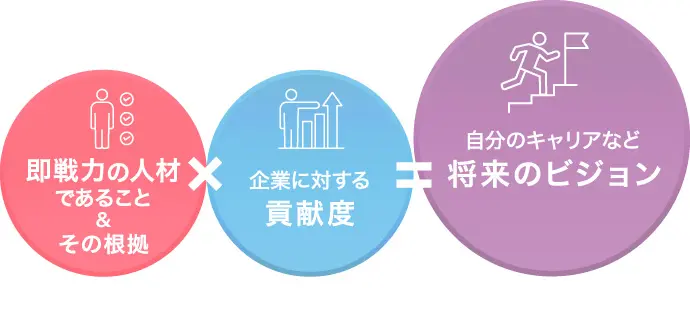 職務経歴書に記載した実績と関連付けながら、「即戦力の人材であることと、その根拠×企業に対する貢献度=自分のキャリアなど将来のビジョン」という方程式を満たす内容を、「結論、根拠、証明」の構成に組み立て、具体的に記載しましょう。